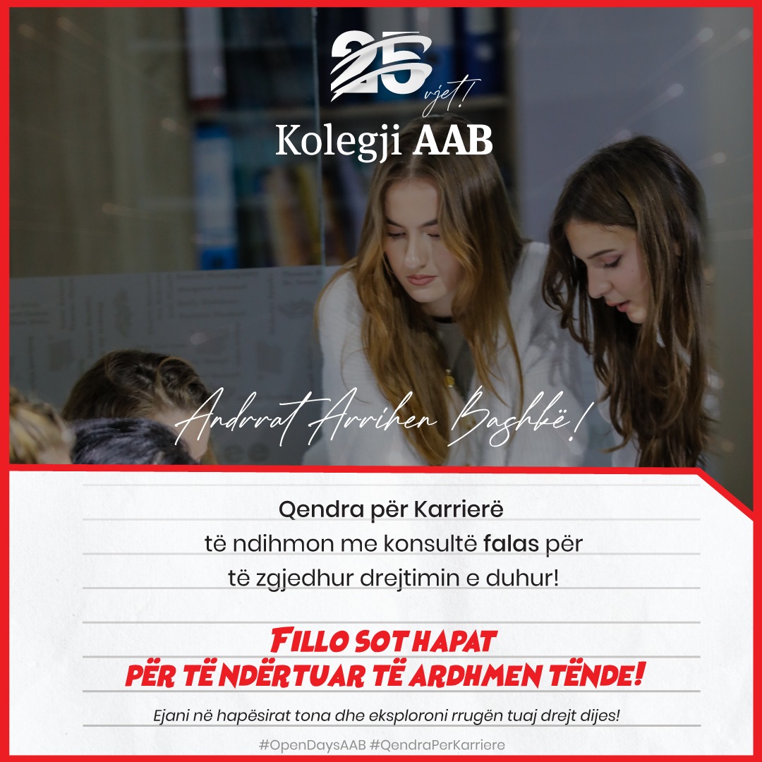 Çdo ditë pune nga ora 08:30-16:30, kjo qendër është e hapur në Kolegjin AAB për të gjithë të interesuarit. Vizitoni Qendrën për Karrierë dhe vendosni drejtimin e duhur për ju dhe të ardhmen tuaj!