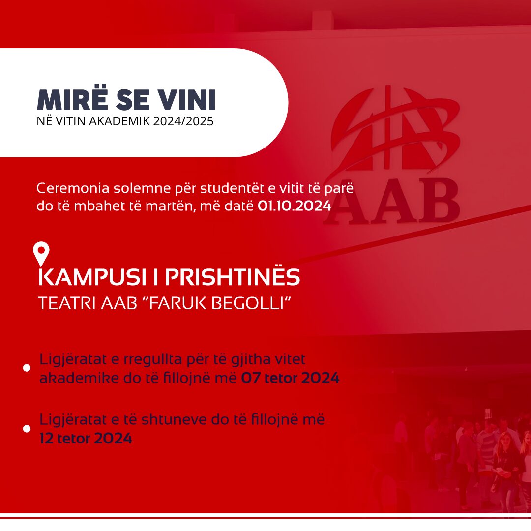 The solemn ceremony for first-year students 📚 will be held on Tuesday, 01.10.2024 at the Pristina Campus, AAB Theater “Faruk Begolli” 🎭.