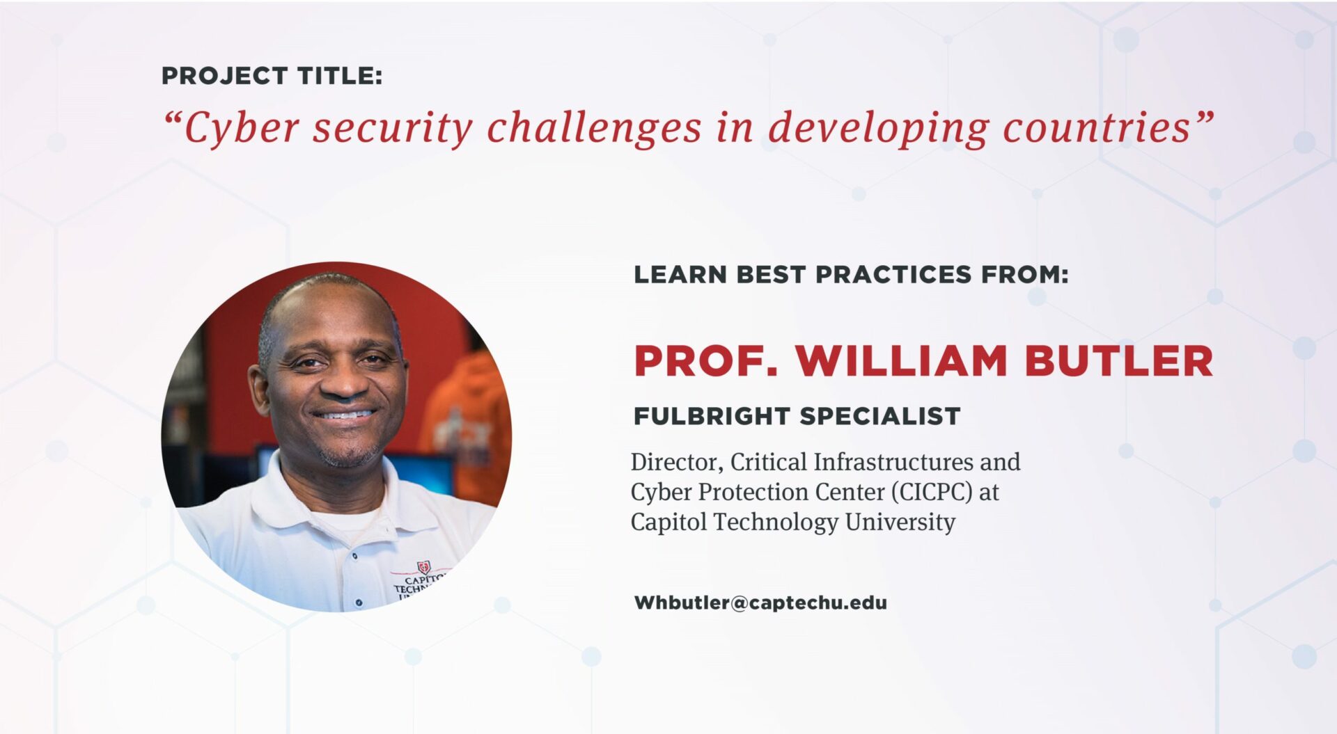 Profesori William (Bill) Butler është udhëheqës i Programit të Sigurisë Kibernetike dhe drejtor i Qendrës për Infrastrukturë Kritike dhe Mbrojtje Kibernetike (CICPC) në Universitetin e Teknologjisë Capitol, në Washington D.C.. Ai ka përvojë mbi 20 vjeçare si inxhinier i rrjetave dhe këshilltar në industrinë e rrjetave dhe të teknologjisë informative.