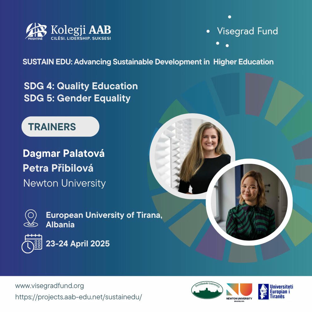 Workshops on SDG 5: Gender Equality and SDG 4: Quality Education will be held on 23-24 April 2025 at the European University of Tirana, Albania with a trainer from Newton University, Czech Republic.