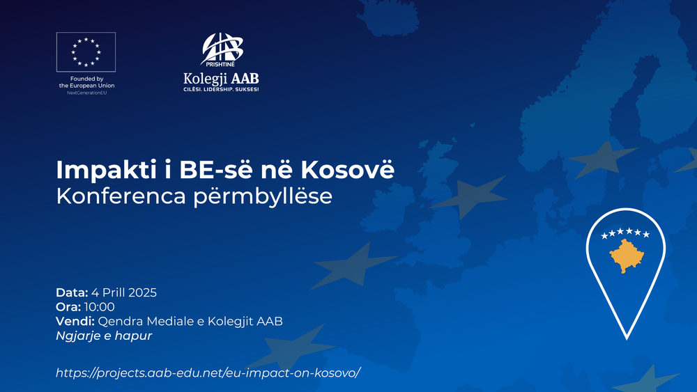 On April 4, 2025, starting at 10:00 AM at the Media Center of AAB College, the closing conference of the “EU Impact in Kosovo” project, funded by the European Union, will be held. This project aimed to create and offer an elective course that informs young people in Kosovo about the role and impact of the European Union in the country’s state-building process.