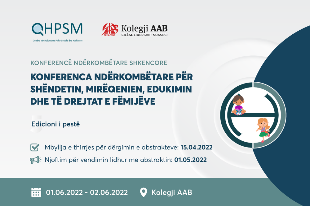 AAB College and the Center for Psychosocial and Medical Research (QHPSM) organize the fifth edition of the international conference on health, well-being, education and children’s rights. This event is held to support children, who represent 34% of the population of Kosovo (Kosovo Agency of Statistics, 2018), so that they can thrive in every aspect of their lives, especially in terms of health, well-being, education and their rights. Furthermore, the purpose of this conference is to bring together scholars from around the world to present advances in the education, health, well-being and rights of children and to foster a conducive environment for the exchange of ideas and information by integrating the theoretical components with the practical. This time, the conference will focus mainly on the well-being of children due to recent developments in the world. Many children are at a disadvantage due to the COVID-19 pandemic, so their physical and mental aspirations will be affected. So post-pandemic well-being and psychological recovery are the main topics of this conference. This conference aims to encourage genuine scientific debate and evidence-based policy-making by promoting children’s health, well-being, education and rights.