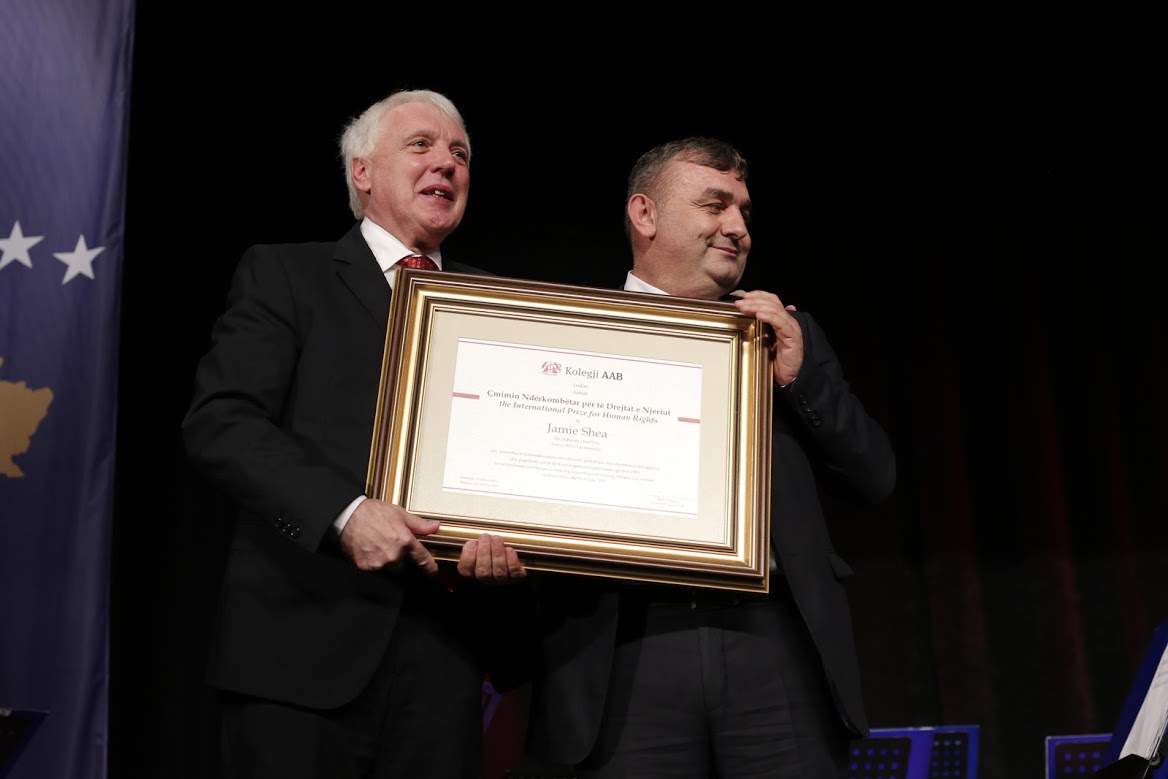 In a solemn ceremony at the AAB theatre, AAB College honored with International prize for Human Rights, former NATO spokesman, Mr. Jamie Shea, for the contribution in helping, supporting and rescuing refugees and civilians in Kosovo during the period from March to June in 1999.