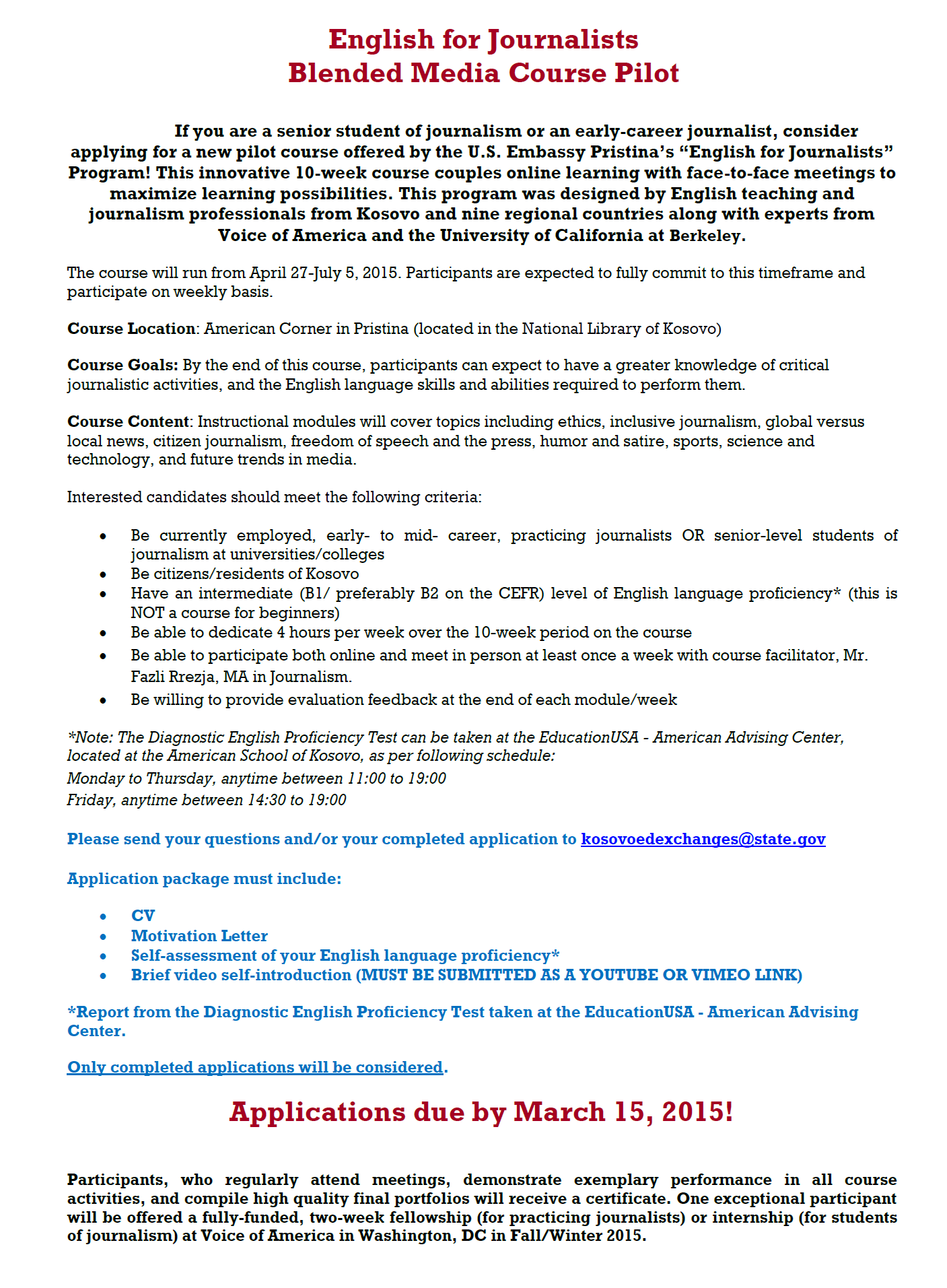 Ambasada Amerikane në Prishtinë, Seksioni për Marrëdhënie me Publikun ka shpallur konkursin për aplikim për një projekt pilot të quajtur Programi “Aglishtja për gazetarë”. Ky është një kurs i përzier 10 javor për media (kurs online) që sponsorizohet nga Departamenti i Shtetit të ShBA, Zyra Regjionale për Gjuhë Angleze për Evropën Qendrore dhe Juglindore dhe nga ambasadat amerikane në Bjellorusi, BeH, Hungari, Kosovë, Lituani, Maqedoni, Rumani, Serbi, Sllovaki dhe Ukrainë.