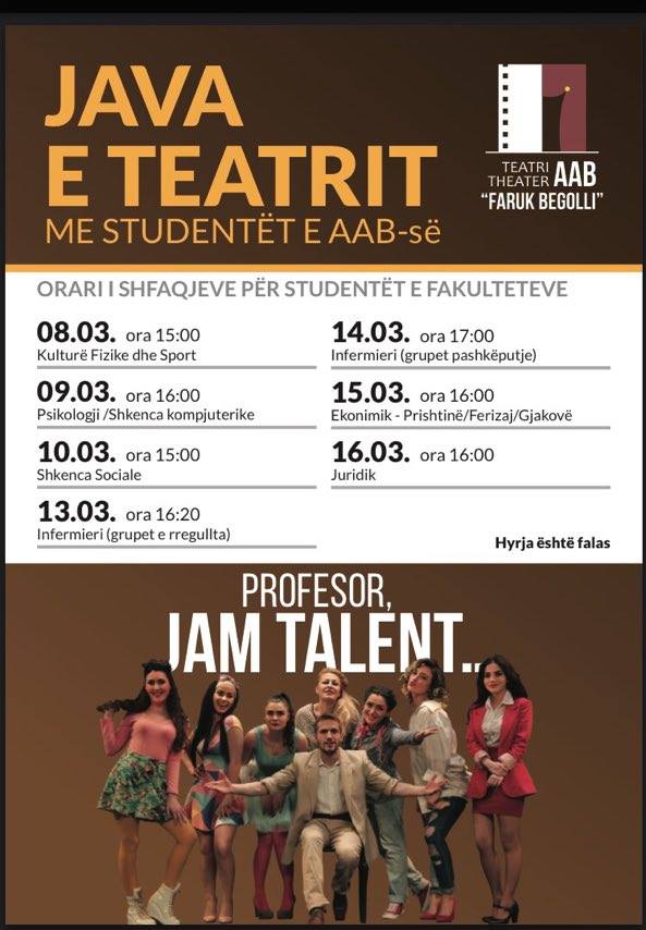 Te gjithe studentet e fakultetit te Psikologjise ftohen qe me 9 Mars, ora 16.00 te marrin pjese ne shfaqjen “Profesor, Jam Talent…”.