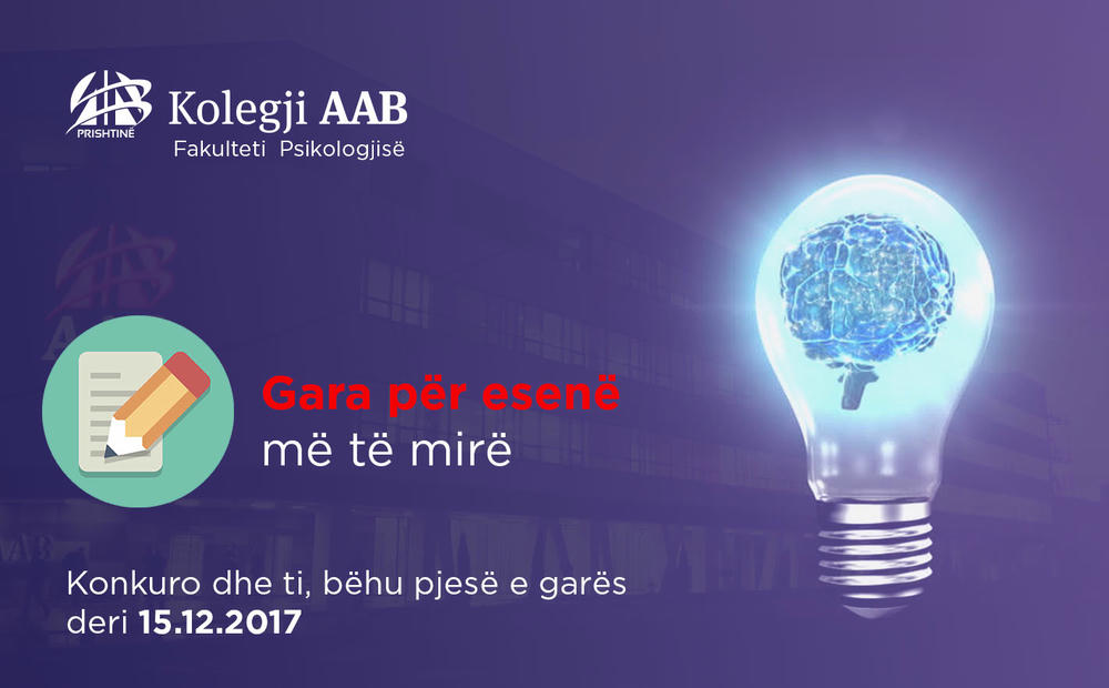 Kolegji AAB – Fakulteti i Psikologjisë, shpall konkurs “Gara për esenë më të mirë” për studentët e psikologjisë. Studentët të cilët dëshirojnë të bëhen pjesë e kësaj gare duhet të përzgjedhin njërën nga temat e mëposhtme, dhe esenë ta dërgojnë në adresën elektronike [email protected], më së largu deri më datën: 25.12.2017.