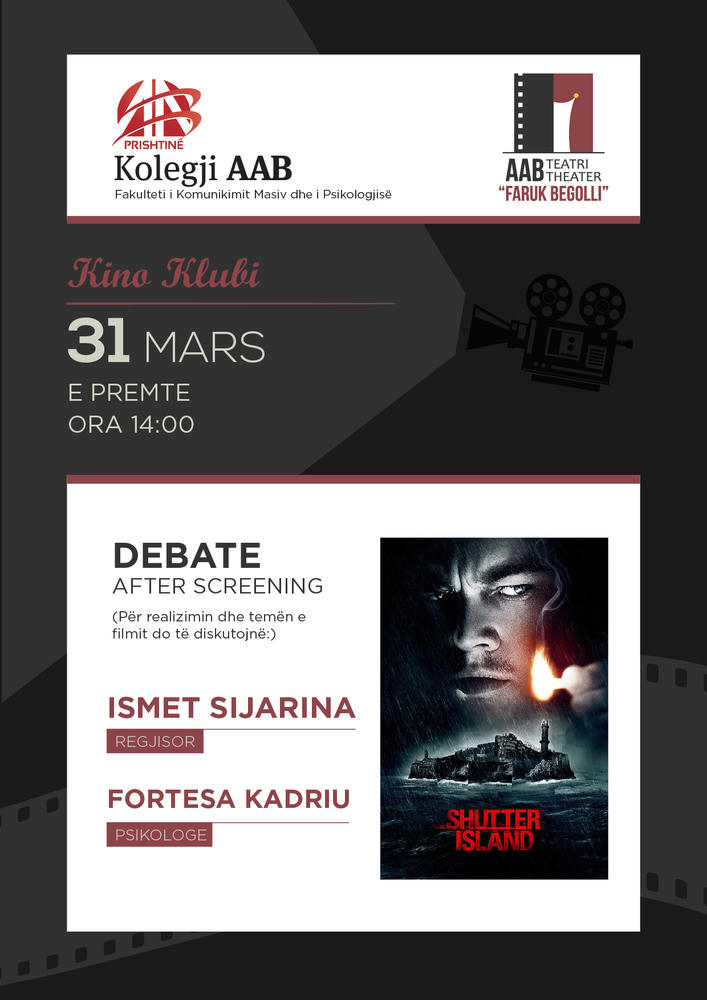 Ftohen te gjithe studentet te shikojne filmin “Shutter Island” ne teatrin e AAB-se. Filmi do te shfaqet ne ora 14.00, 31 mars, 2017. Poashtu, do te zhvillohet debat pas filmit. Per me shume, info shikoni me poshte.