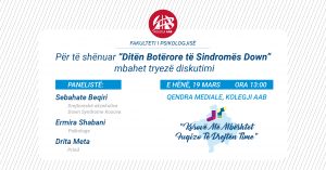 ju njoftojmë se Fakulteti i Psikologjisë me rastin e Ditës Botërore të Syndromes Down, me datë 19 mars me fillim nga ora 13:00, do të organizoj Tryezë Diskutimi në temën “Kosovë më mbështet, fuqizo të drejtën time”