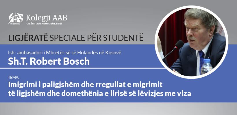 Ish- ambasadori i Mbretërisë së Holandës në Kosovë, Sh.T. Robert Bosch, mbanë ligjëratë speciale për studentët e Kolegjit AAB, në temën: “Imigrimi i paligjshëm dhe rregullat e migrimit të ligjshëm dhe domethënia e lirisë së lëvizjes me viza” .