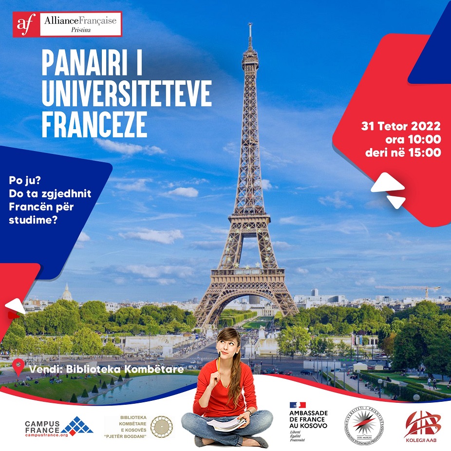 Në Bibliotekën Kombëtare të Prishtinës me 31 tetor nga ora 10:00 deri në 15:00, do të mbahet Panairi i Universiteteve Franceze, ku bashkëorganizator është Kolegji AAB.Ky panair do shërbej si mundësi për zbulimin e programeve mësimore, shkëmbimeve dhe mundësive për të studiuar në Francë me përfaqësuesit e shumtë të universiteteve franceze.Pjesëmarrja e Kolegjit AAB si bashkëorganizator në këtë edicion të panairit, luan një rol të rëndësishëm në krijimin e raporteve me universitetet franceze dhe mundësitë për studentët në eksplorimin akademik edhe jashtë kufijve.