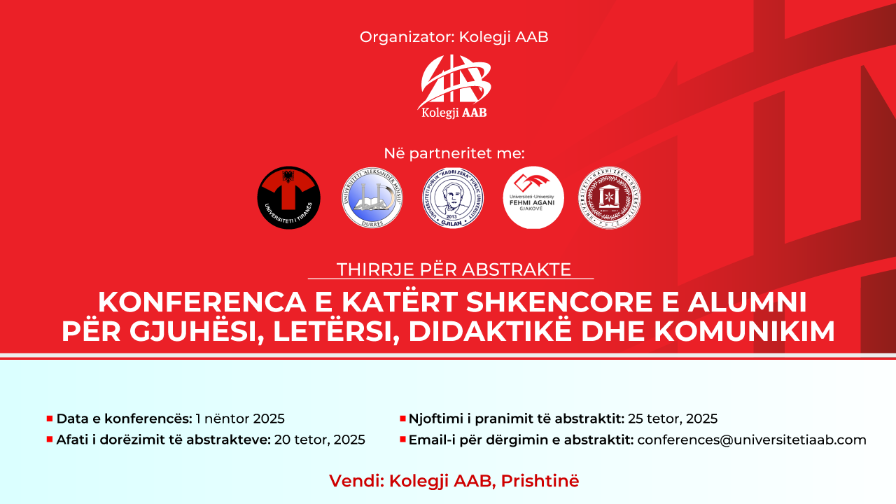 Kolegji AAB, në partneritet me Universitetin e Tiranës, Universitetin e Durrësit, Universitetin “Fehmi Agani” Gjakovë, Universitetin “Haxhi Zeka” Pejë, Universitetin “Kadri Zeka” Gjilan, organizon ‘Konferencën e Katërt Shkencore të ALUMNI-t në Gjuhësi, Letërsi, Didaktikë dhe Komunikim’. Konferenca do të mbahet në datën 1 nëntor 2025, në Kolegjin AAB.