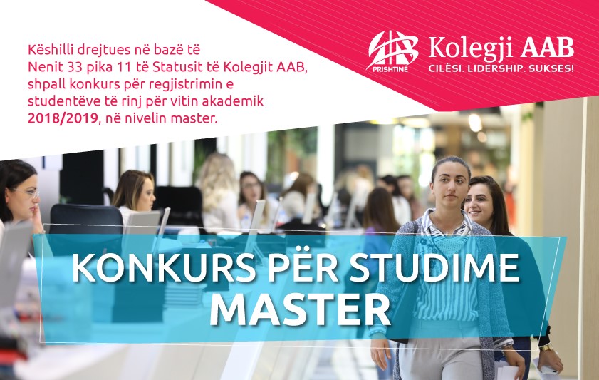 Këshilli drejtues në bazë të Nenit 33 pika 11 të statusit të Kolegjit AAB, shpall konkurs për regjistrimin e studentëve të rinj për vitin akademik 2018/2019, në nivelin master.