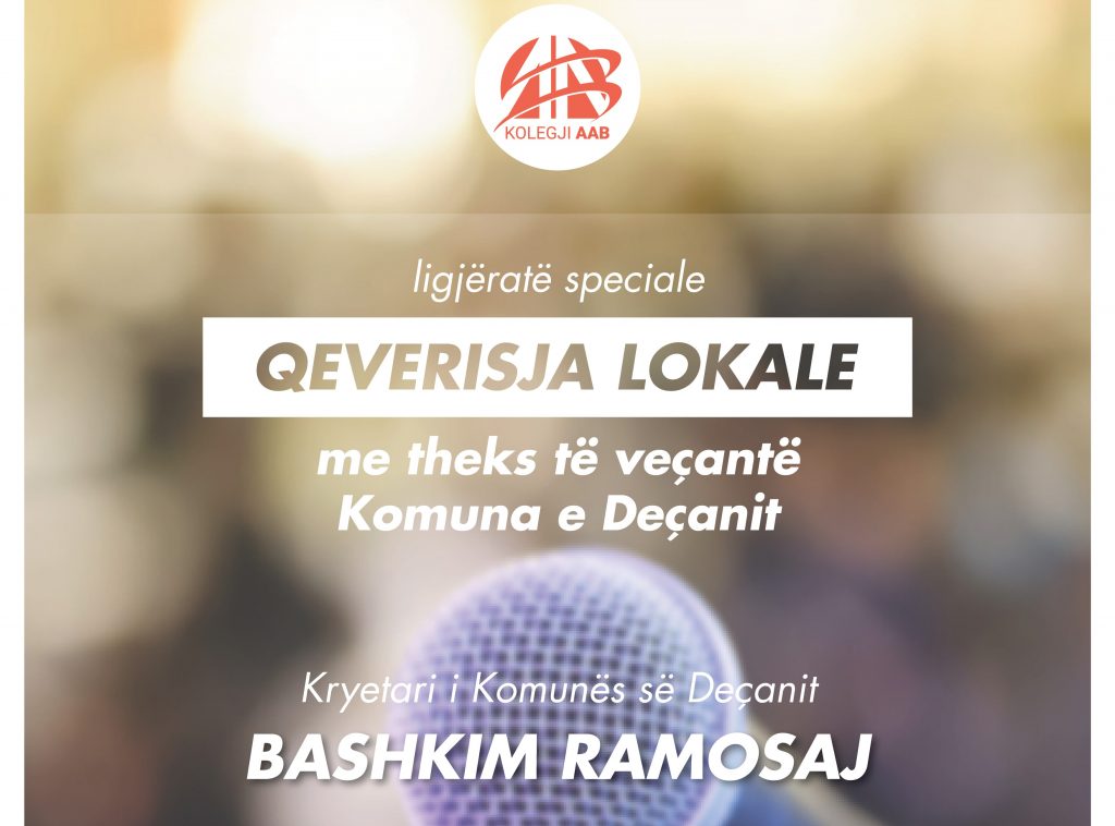 kemi kënaqësinë t’ju ftojmë të merrni pjesë në ligjëratën e organizuar nga Kolegji AAB me kryetarin e Komunës së Deçanit, Bashkim Ramosaj, me temën “Qeverisja lokale me theks të veçantë Komuna e Deçanit”.