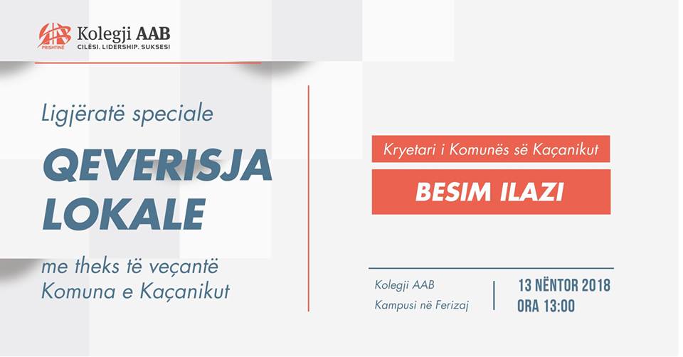 kemi kënaqësinë t’ ju ftojmë të merrni pjesë në ligjëratën e organizuar nga Kolegji AAB me kryetarin e komunës së Kaçanikut, z. Besim Ilazi, me temën “Qeverisja lokale, me theks të veçantë Komuna e Kaçanikut”.