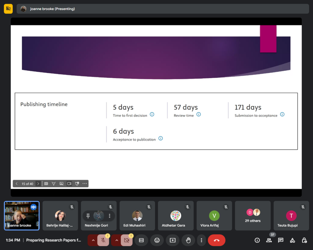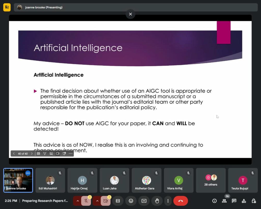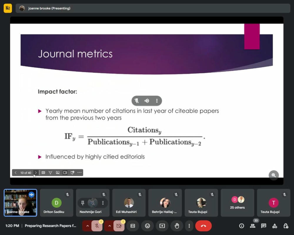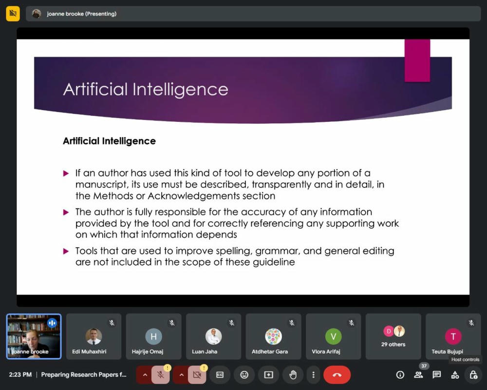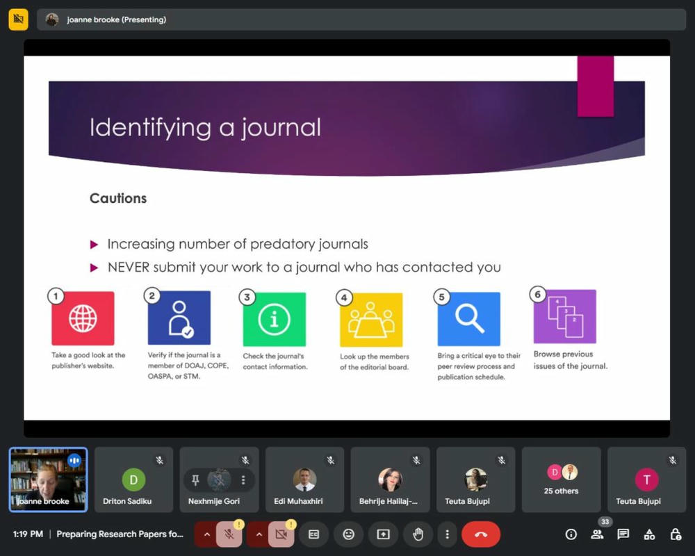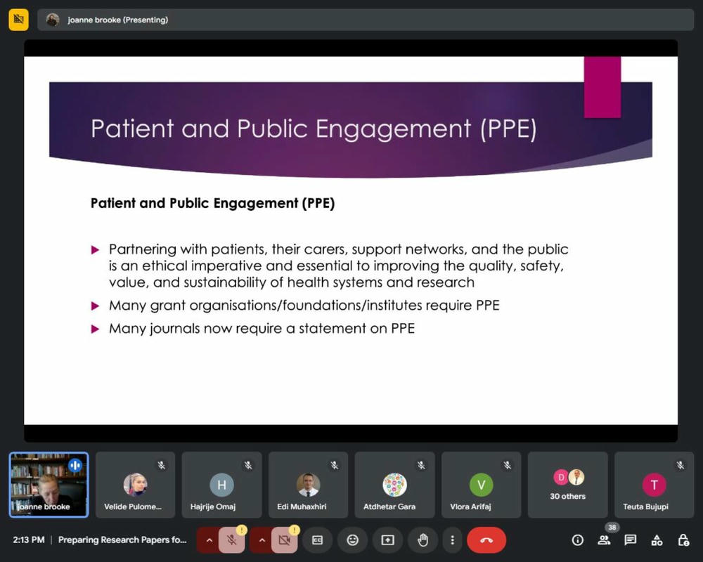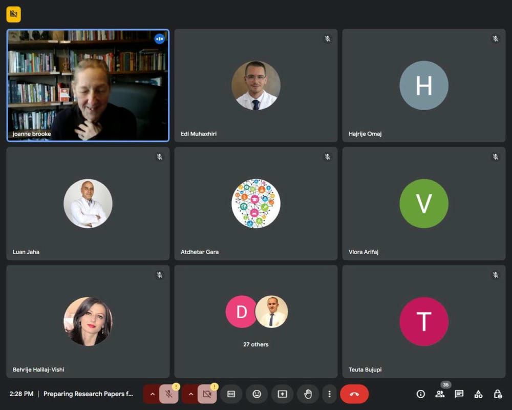 Trajnimi u zhvillua online dhe kishte për qëllim ngritjen e njohurive rreth punës hulumtuese dhe mbështetjen e stafit akademik për të publikuar punimet e tyre në revistat ndërkombëtare të infermierisë.