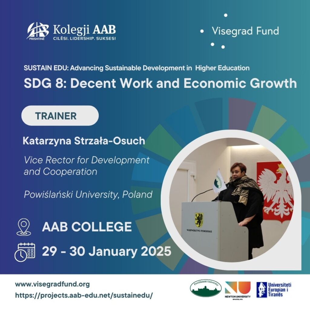 Njëra nga punëtoritë, me titull SDG 3: Good Health and Well-being, do të udhëhiqet nga Tomasz Bojar Fijałkowski, Zëvendës Rektor për Shkencë dhe Cilësi të Arsimit në Powiślanski University, Poloni. Punëtoria tjetër mbi SDG 8: Decent Work and Economic Growth do të udhëhiqet nga Katarzyna Strzała-Osuch, Zëvendës Rektore për Zhvillim dhe Bashkëpunim në Powiślanski University, Poloni.