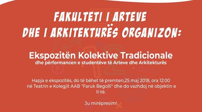 Në Kolegjin AAB, nesër (e premte) më 25 maj 2018 do të bëhet hapja e “Ekspozitës Kolektive Tradicionale” me përformancen e studentëve të Arteve dhe Arkitekturës të këtij kolegji.