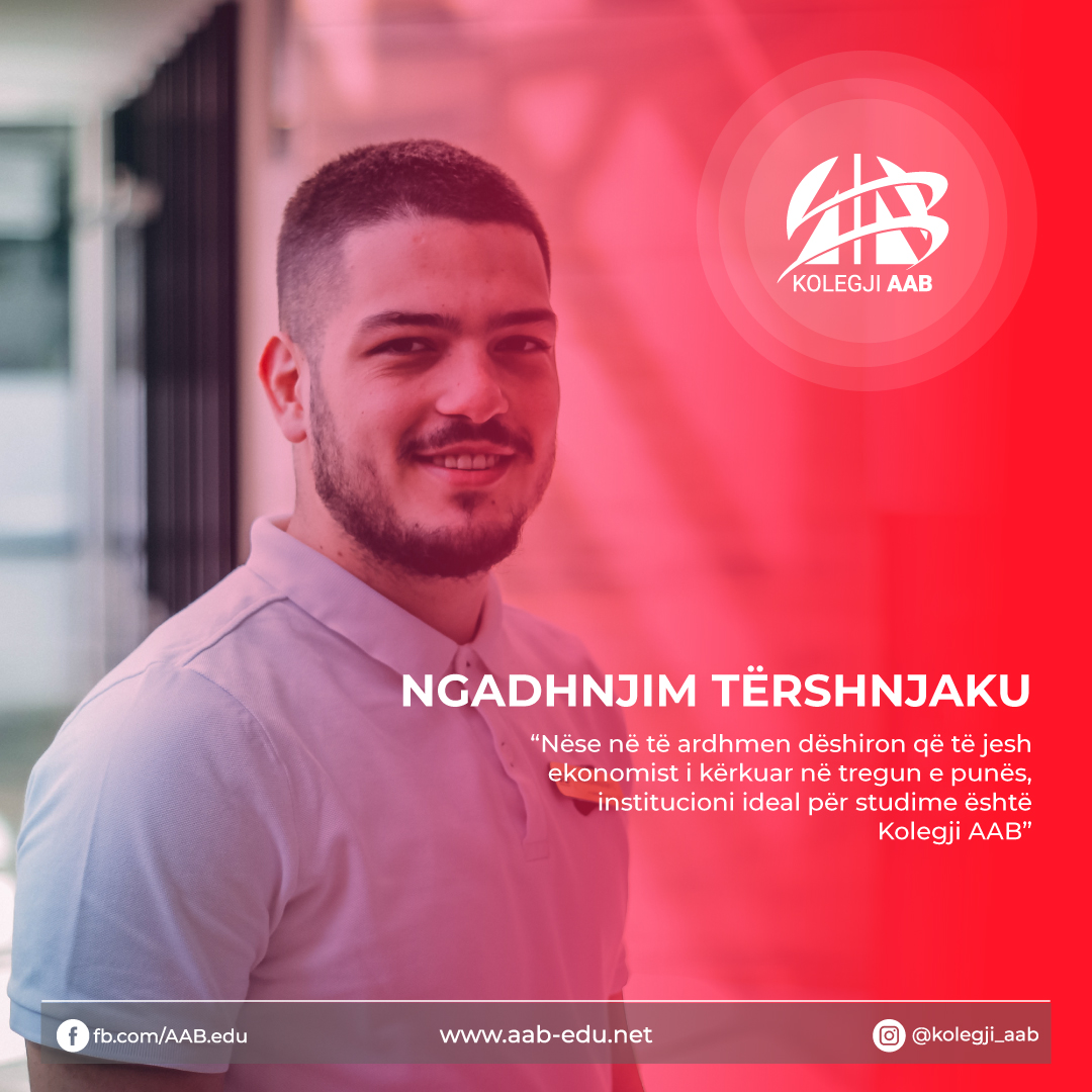 Ngadhnjim Tërshnjaku është student i Fakultetit Ekonomik në Kolegjin AAB. Ai tashmë vijon vitin e fundit të studimeve në drejtimin Marketing dhe Administrim Biznesi. Ai ende pa përfunduar studimet është angazhuar si staf profesional në Kolegjin AAB.