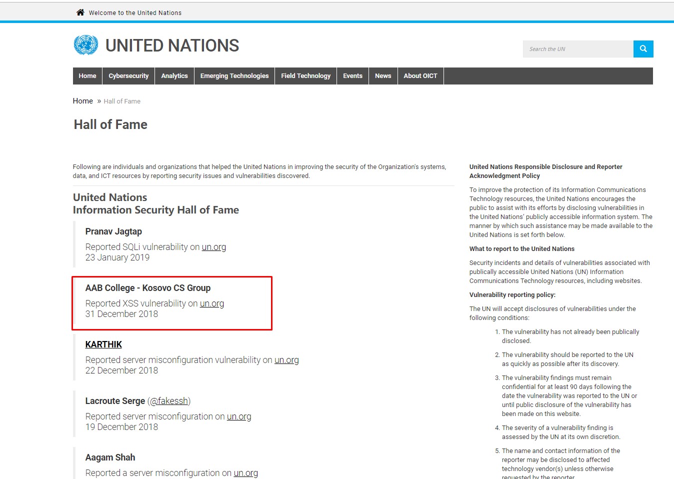 Pasi kanë gjetur këtë dobësi në faqen e tyre, grupi i studentëve: Elvis Pjetraj, Zanafill Kastrati, Alush Zeqiri, Andi Kosumi, Endi Ibrahimi, Fatlum Veselaj, Adenis Ahmeti, Flamur Kurti, Viona Morina, Mehmet Spahiu, Arber Berisha e Arjanit Ademaj, ka raportuar gjetjen tek organi përkatës, dhe në shenjë falënderimi për ndihmën e dhënë në funksion të përmirësimit të sigurisë së sistemit, të të dhënave dhe resurseve të teknologjisë informative dhe komunikimit, Kombet e Bashkuara kanë vendosur që grupin e Sigurisë Kibernetike të Kolegjit AAB në të ashtuquajturën “Hall of Fame”.