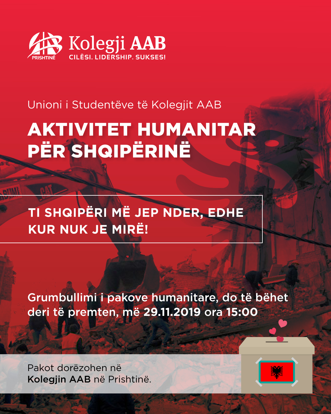 duke bashkëndjerë dhembjen me vëllezërit tanë në Shqipëri, ne Unioni i Studentëve të Kolegjit AAB, jemi bërë bashkë që festën e Flamurit Kombëtar ta kthejmë në aktivitet humanitar për viktimat e tërmetit të 26 nëntorit në Shqipëri.