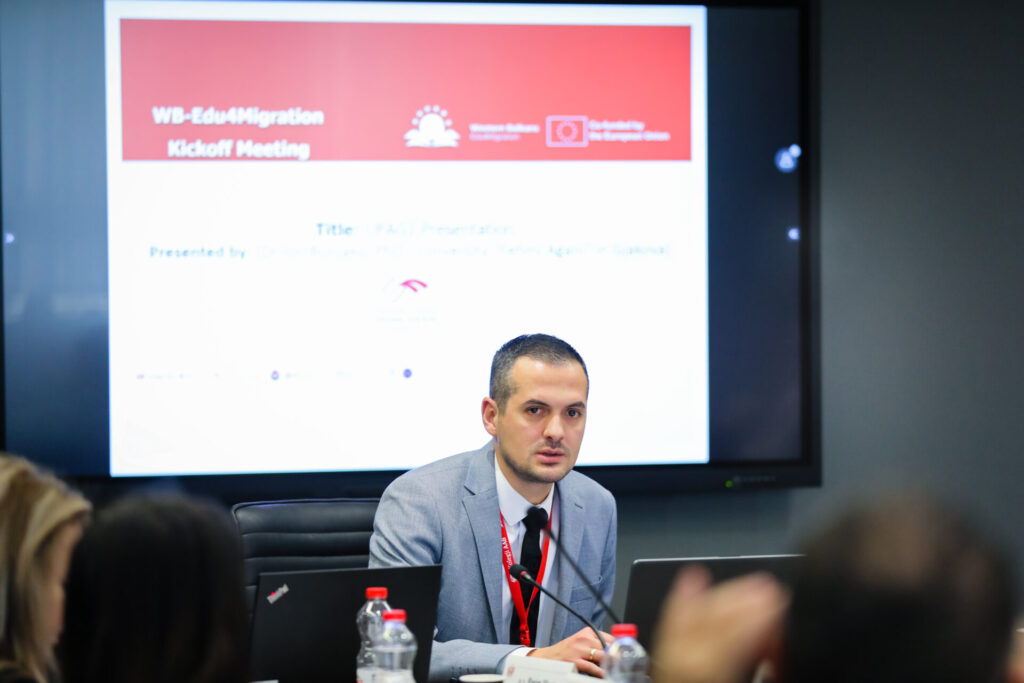 Dekani i Fakultetit të Psikologjisë, Naim Telaku, garantoi mbështetje të plotë për implementimin e projektit, duke e lidhur atë me edukimin dhe sfidat e migrimit kurse Ilirjana Geci, drejtoresha e Zyrës së Projekteve në Kolegjin AAB, përshëndeti të pranishmit, duke nënvizuar rëndësinë e projektit dhe përkushtimin e vazhdueshëm të Zyrës së Projekteve në bashkëpunim me stafin për realizimin e iniciativave të tilla. Në këtë projekt janë të përfshira institucione si: Universiteti “Fehmi Agani” Gjakovë, Universiteti i Tiranës, Kolegji Universitar LOGOS, Instituti i Kulturës Rome në Shqipëri, UCL University College, Fachhochschule Salzburg dhe IULM University. Gjatë takimit të pranishmit poashtu realizuan prezantime për institucionet e tyre, duke treguar të dhëna rreth programeve tëstudimit, numrit të studentëve, strukturës organizative etj. Nëpjesën e dytë të takimit u mbajt edhe një punëtori e cila ndërlidhej me menaxhimin e strukturave të projektit dhe planin e menaxhimit të projektit.