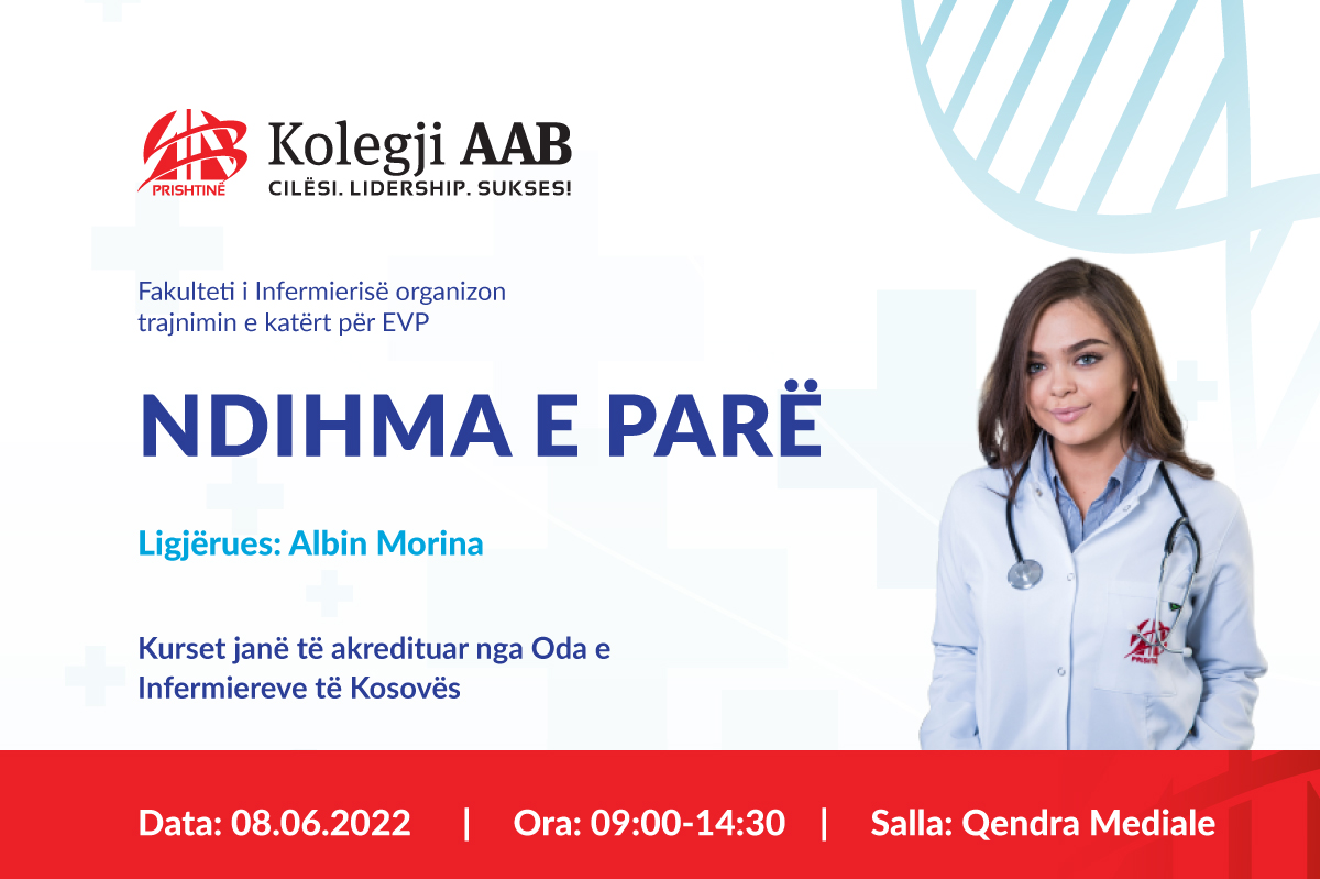 Kursi ndërkombëtar EVP (Edukimi i vazhdueshem profesional) do të mbahet në muajin qeshor me datën 08.06.2022 nga ora 09:00-14:30, në Qendrën Mediale të Kolegjit AAB. Tema e këtij kursi ndërkombëtar një ditor do të jetë ”Ndihma e parë”, ku ligjërues do të jetë Albin Morina.
